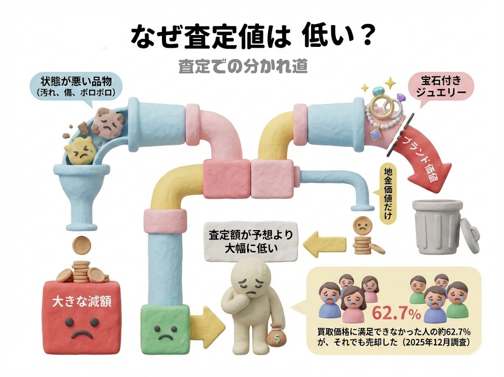 様々な理由がありますが、事前の査定があっても、状態によって値段が下がる事が多いです。また宝石類がブランド価値を判定されずに地金だけの価値として査定されてしまう場合もあります。